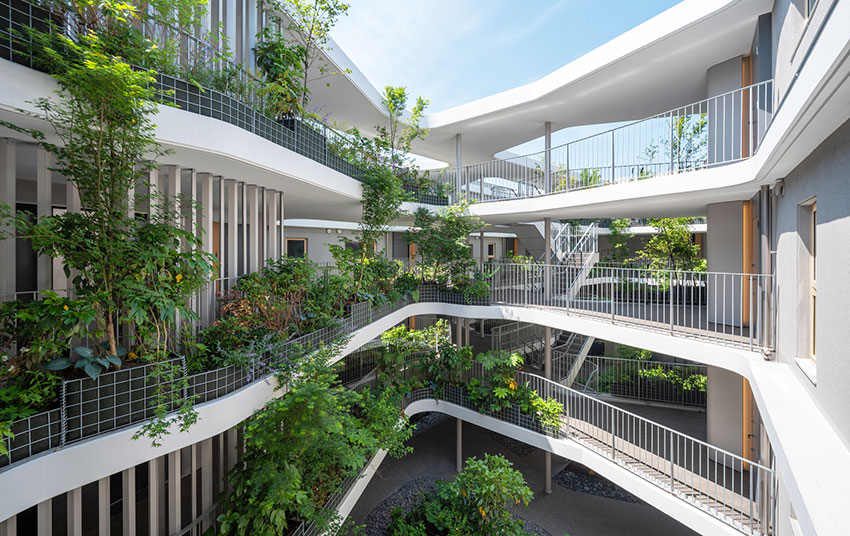 社員寮を建て替え、居住者の健康増進と脱炭素を両立させる都心型中層賃貸集合住宅とした作品である。防犯性とプライバシーの観点から採用されたロの字型配置の中央に、フライングコリドーが架けられている。大きさの異なる7つのボイドから4層に自然光が届く開放的な多重中庭が構成され、北向き住戸にも南面採光を確保している。二住戸に対して1本の分岐コリドーが接続され、豊かに緑化された中庭からアクセスするようになっている。中庭にはエレベーターが2機あるが、階段の上り下りで立体的緑化と光のコントラストによる景色の変化が感じられ、歩きたくなる環境が形成されている。コミュニティ形成のニーズが相対的に低い賃貸住宅であるが、豊かな中間領域が住人同士の自然なコミュニケーションを生む仕掛けにもなっている。在来種や地域の生態と連携する樹種が選定されており、外構も含めて緑化することで、敷地内で完結しない都市の緑地と生物多様性のネットワーク形成が図られている。