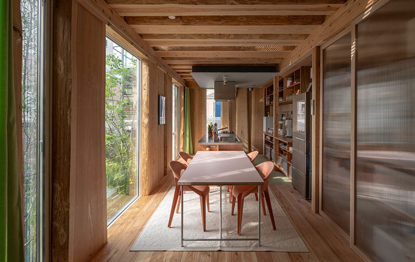 特筆すべきは、この“森のような内部”が密集住宅地における性能と両立している点である。外壁は防火性能に優れた窯業系でしっかりと包み、外断熱によって高断熱・高気密を確保しつつ、必要な部分だけスリット状に外へ開き、光や風を適切に取り込む。外側は控えめでありながら、内部では大径木の力強い空間が立ち上がるという対比が、本作の独自性を支えている。