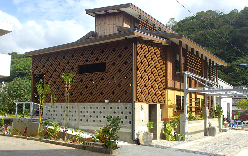 本住宅では、日射遮蔽の為に必要となる南庇の張り出し寸法を確保するため、台風の多い沖縄の気象条件を考慮した鉄骨パーゴラ支柱を活用した吹上げ対策の実施や、夕刻以降に日射が多くなる西面に、斜め格子で囲われた快適なテラス空間を設ける工夫を行うと共に、サンゴ石入りの漆喰ぬりかべをユイマール(助け合いの精神)の伝統を引き継ぐワークショップにより施工するなど様々な取組を行っている。